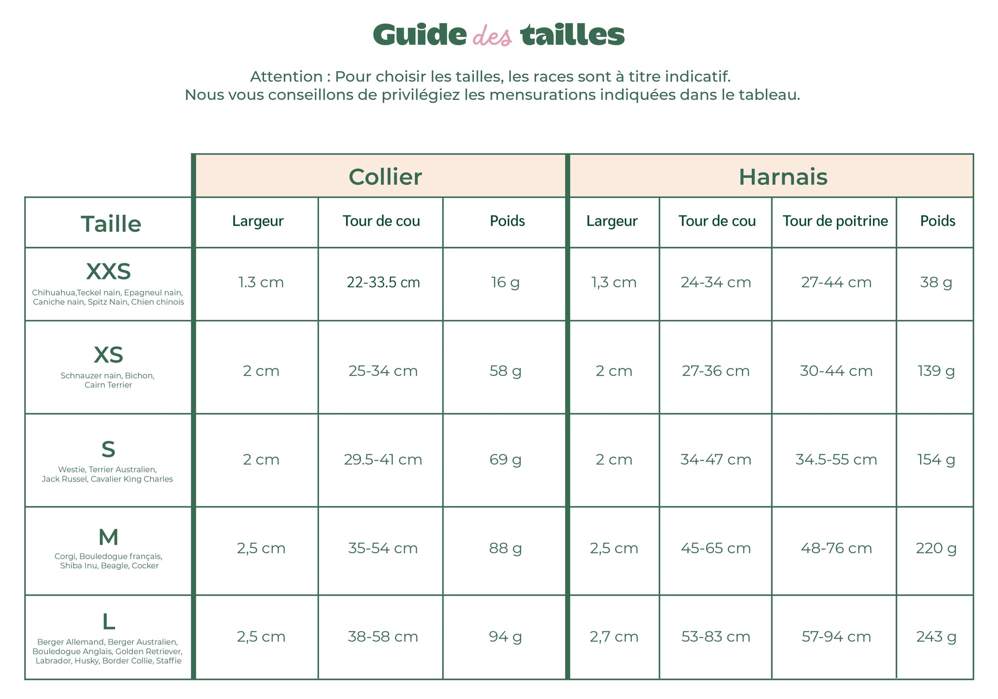 Du Chihuahua au Golden Retriever, nos colliers s’adaptent à toutes les morphologies. Le guide des tailles est disponible parmi les photos, avec des exemples de races pour vous guider. Et si vous avez un doute, écrivez-nous !